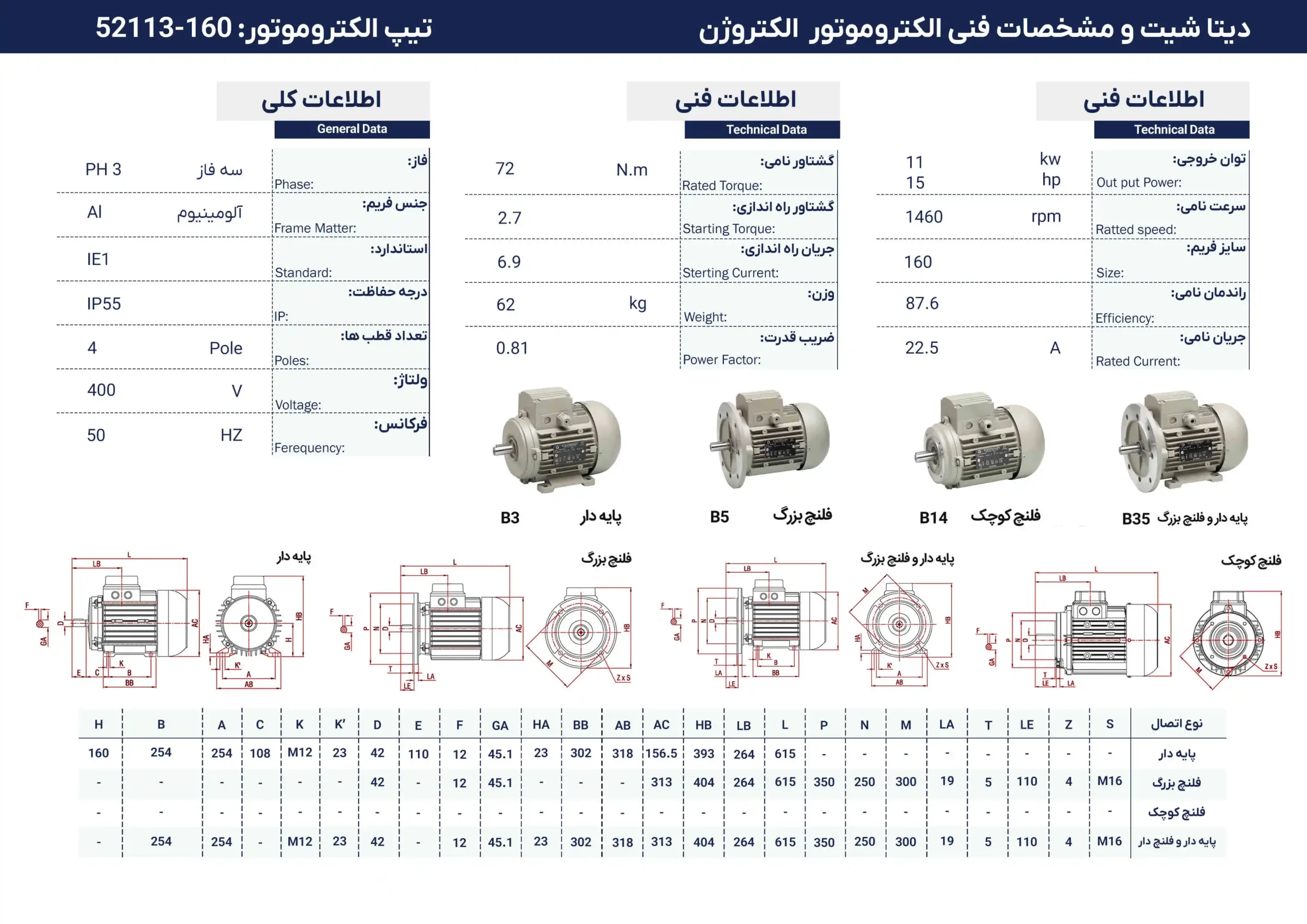الکتروموتور الکتروژن سهفاز ۱۵ اسب (۱۱ کیلووات) – پوسته آلومینیوم ۱۵۰۰ دور
