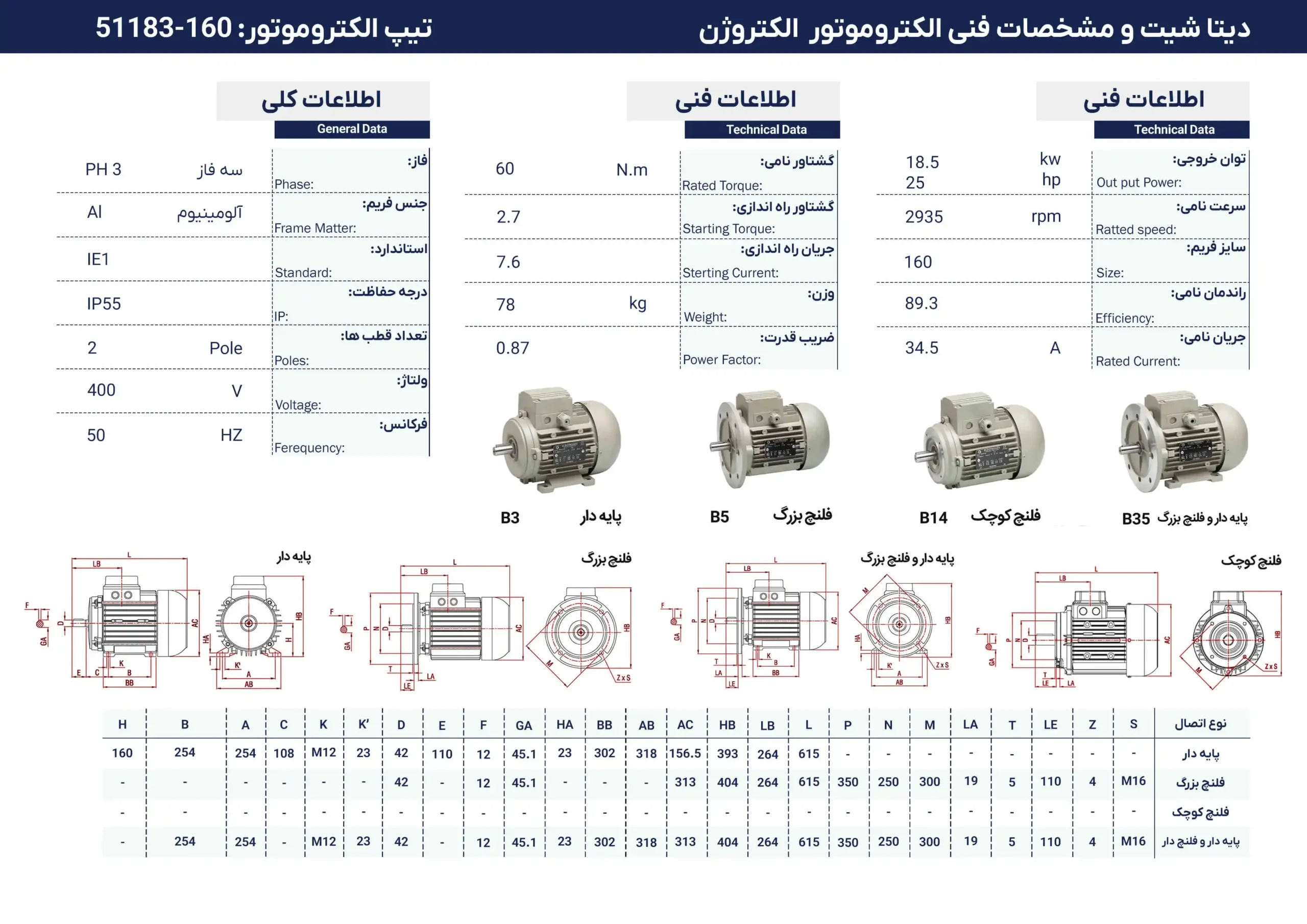الکتروموتور الکتروژن سه‌فاز ۲۵ اسب (۱۸.۵ کیلووات) – پوسته آلومینیوم ۳۰۰۰ دور