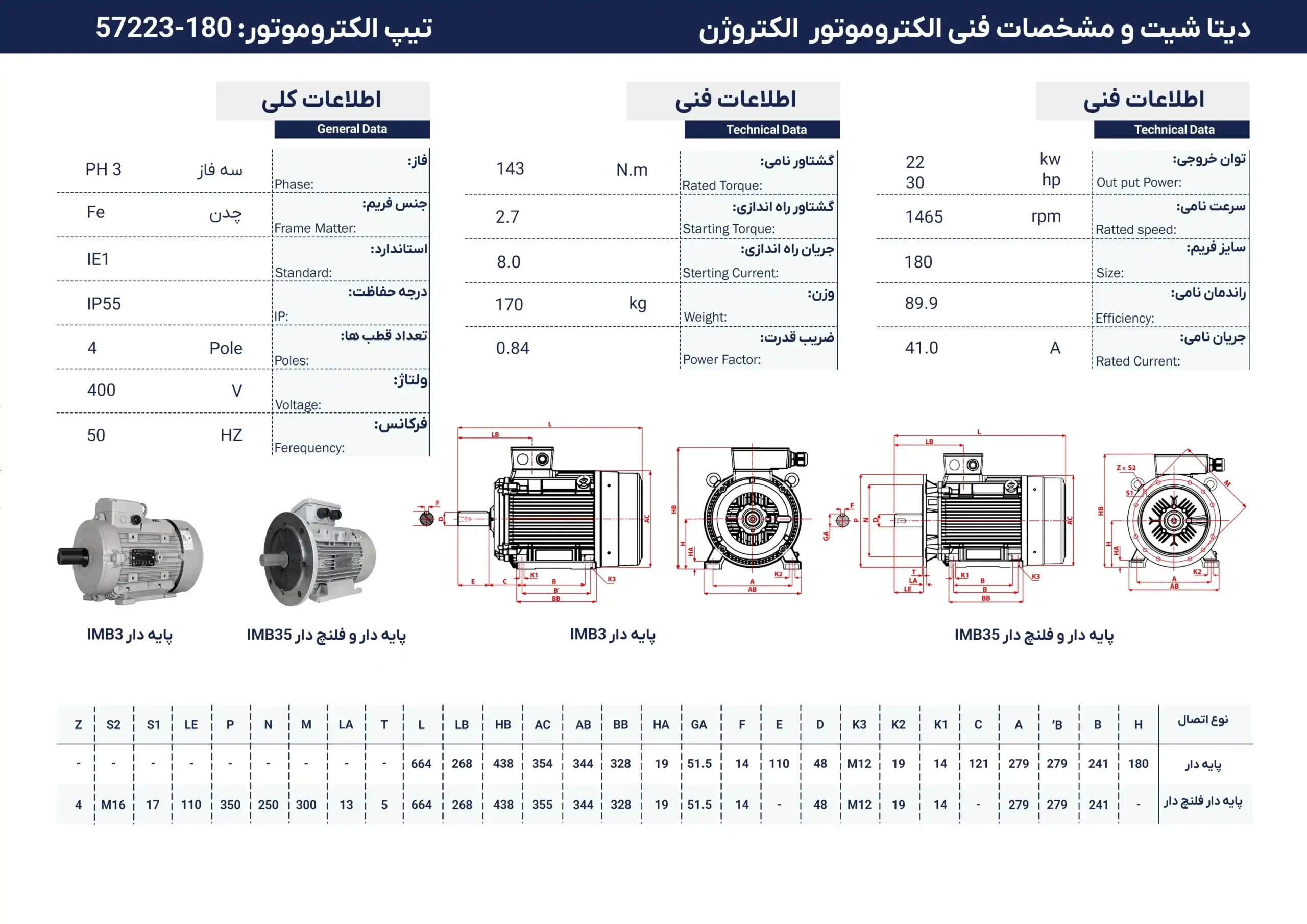 الکتروموتور الکتروژن سهفاز ۳۰ اسب (۲۲ کیلووات) – پوسته چدنی ۱۵۰۰ دور
