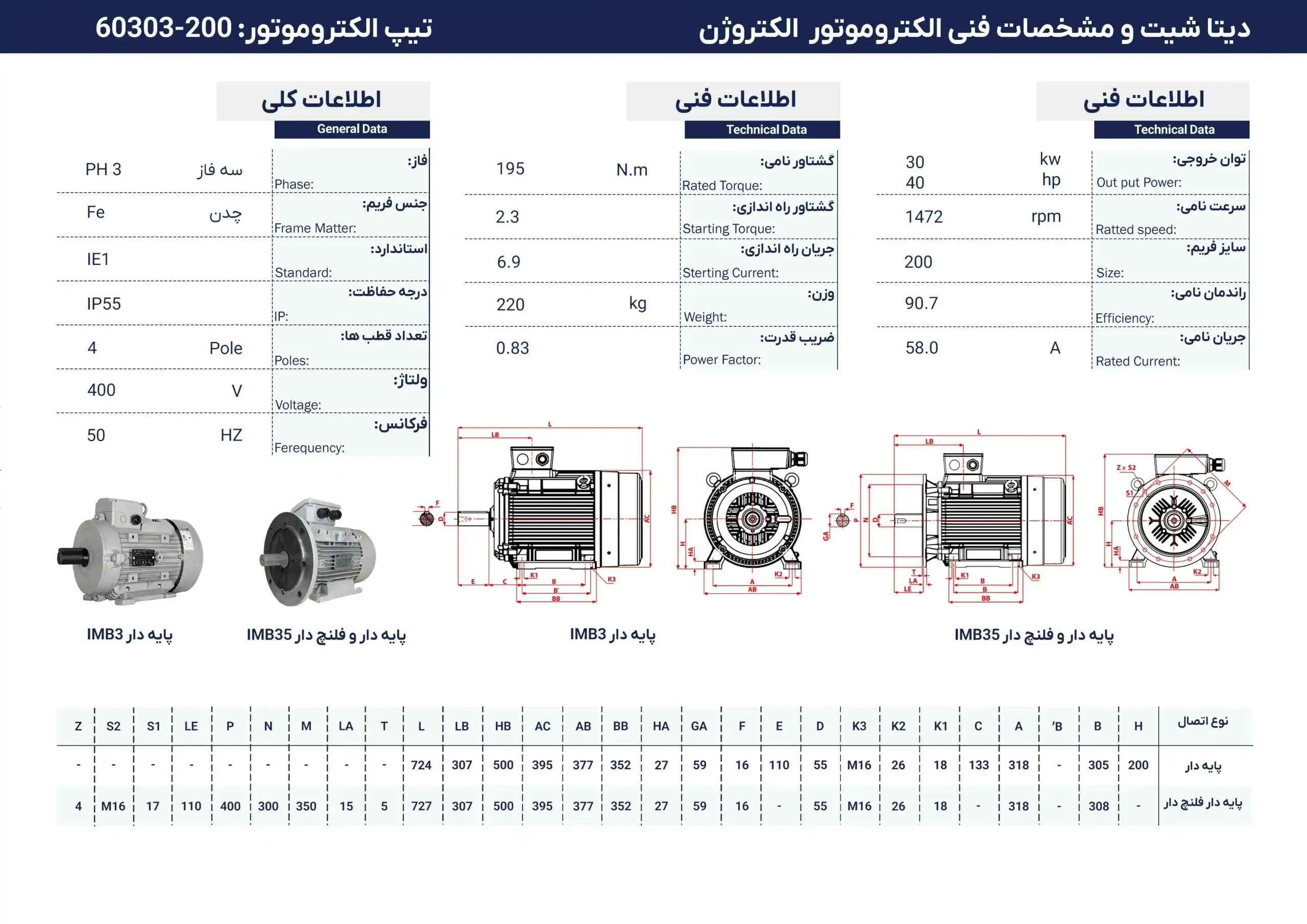 الکتروموتور الکتروژن سهفاز ۴۰ اسب (۳۰ کیلووات) – پوسته چدنی ۱۵۰۰ دور