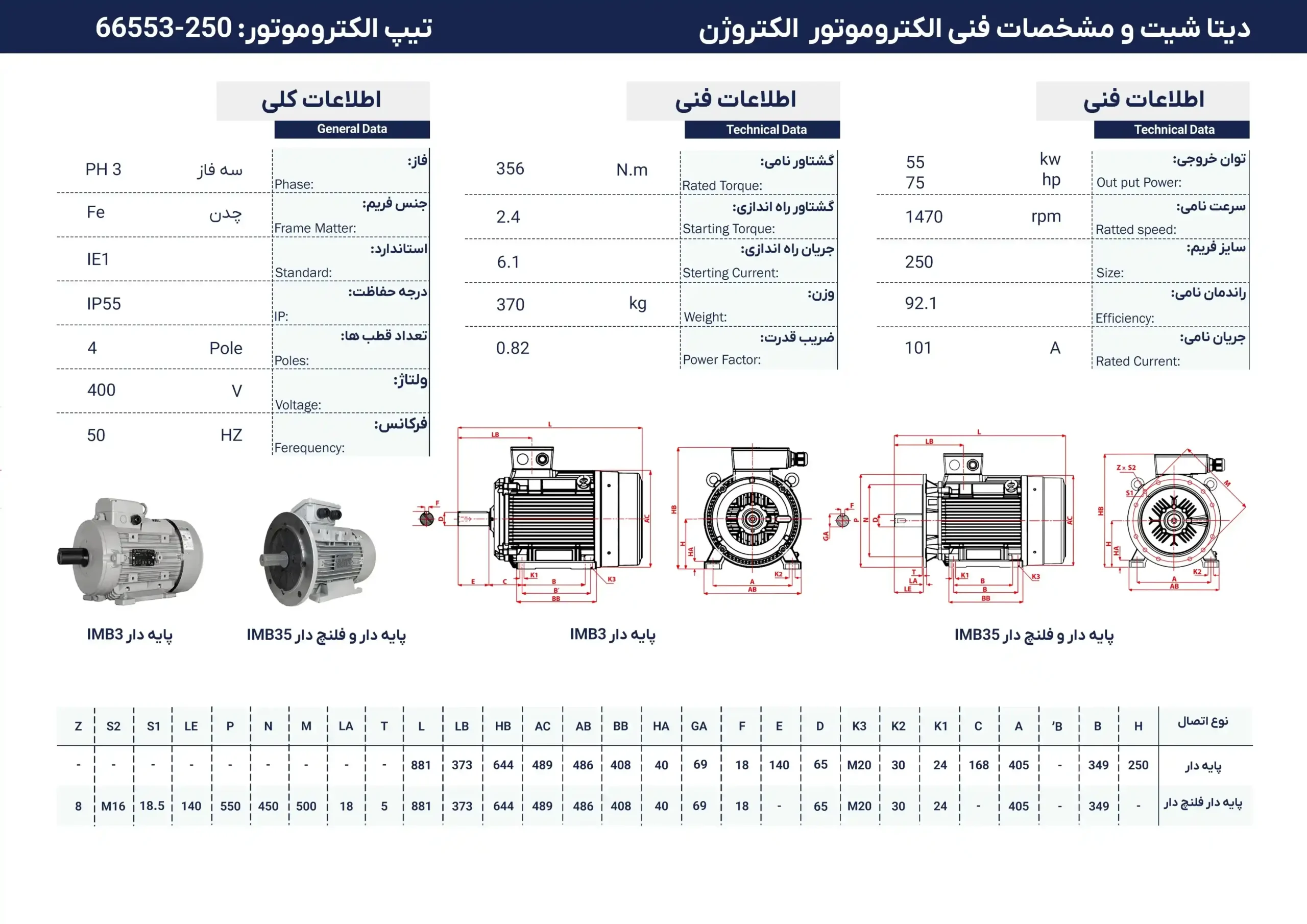 کلاس حفاظتی IP55 در این مدل، ایمنی بالایی در برابر نفوذ رطوبت و گردوغبار فراهم کرده است. به همین دلیل، این موتور انتخاب مناسبی برای محیطهای مرطوب یا دارای ذرات معلق است.