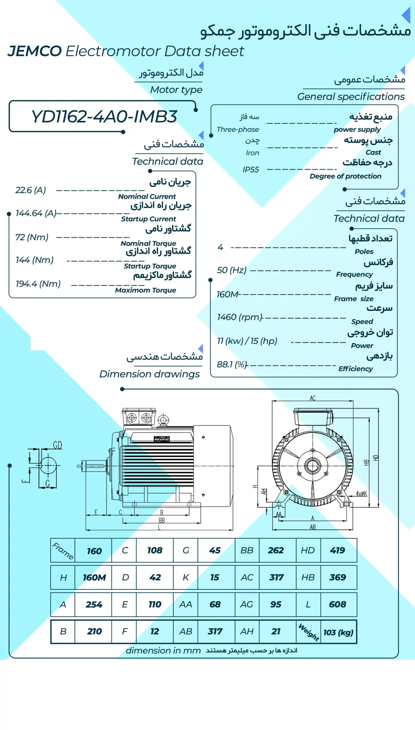 الکتروموتور سهفاز جمکو (Jemco) با توان ۱۱ کیلووات (۱۵ اسب بخار) و سرعت اسمی ۱۵۰۰ دور در دقیقه (۴ پل)، یک موتور استاندارد و پرکاربرد در بسیاری از کارخانجات و واحدهای تولیدی است. این سطح از توان، اغلب به عنوان یک اسب بخار کاری در تجهیزات فرآیندی با حجم متوسط مورد نیاز است. جمکو، به عنوان تولیدکننده داخلی، این موتورها را با تأکید بر دوام و قابلیت اطمینان بالا تولید میکند تا در زمره الکتروموتورهای صنعتی قابل اعتماد قرار گیرد.