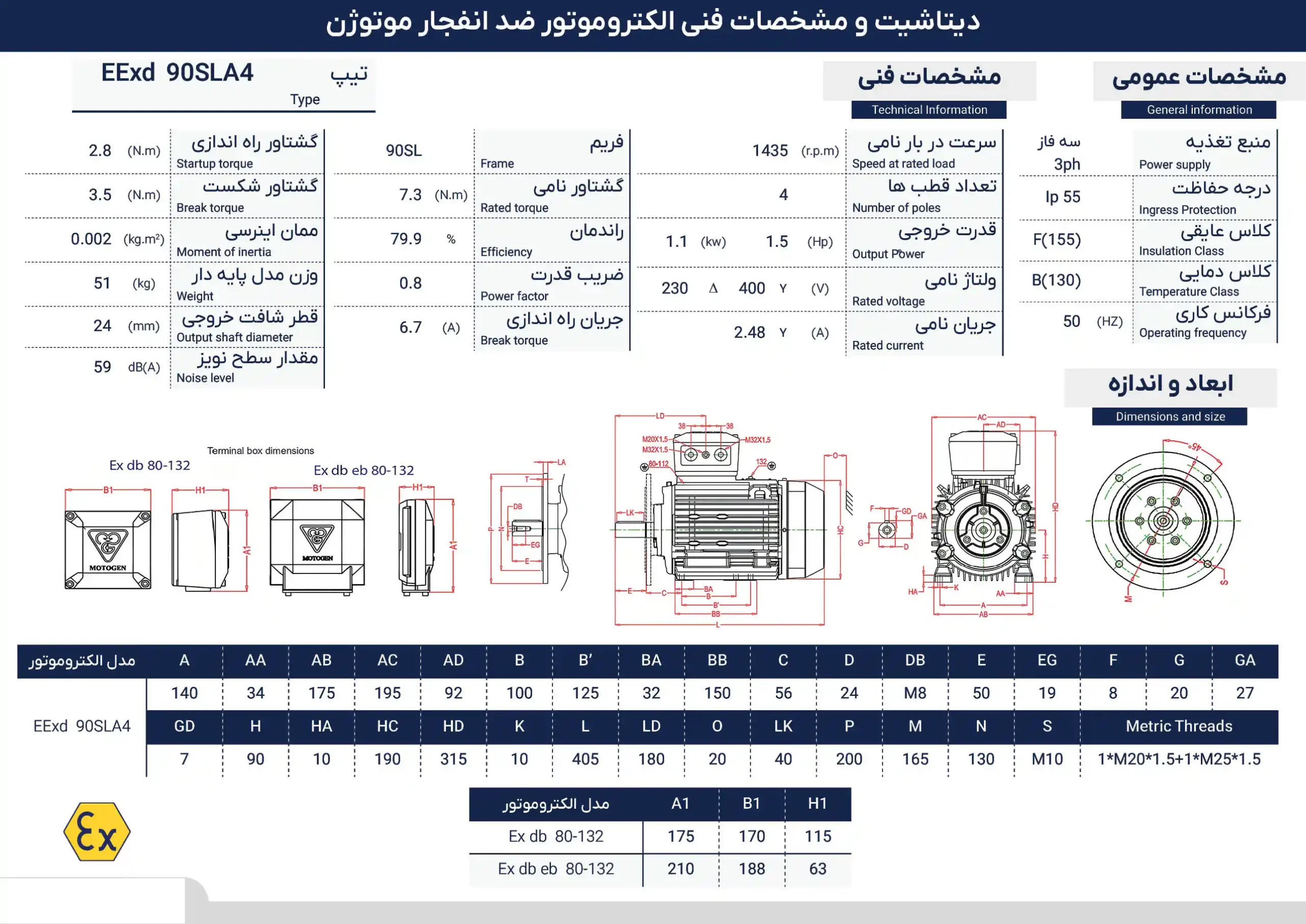 تیپ الکتروموتور: EEXD90SLA4سرعت: 4 پل 1435 دور در دقیقهمناسب برای کار دائمجنس سیم پیچ: مسالکتروموتور های ضد انفجار موتوژن دارای گواهی ATEX است.