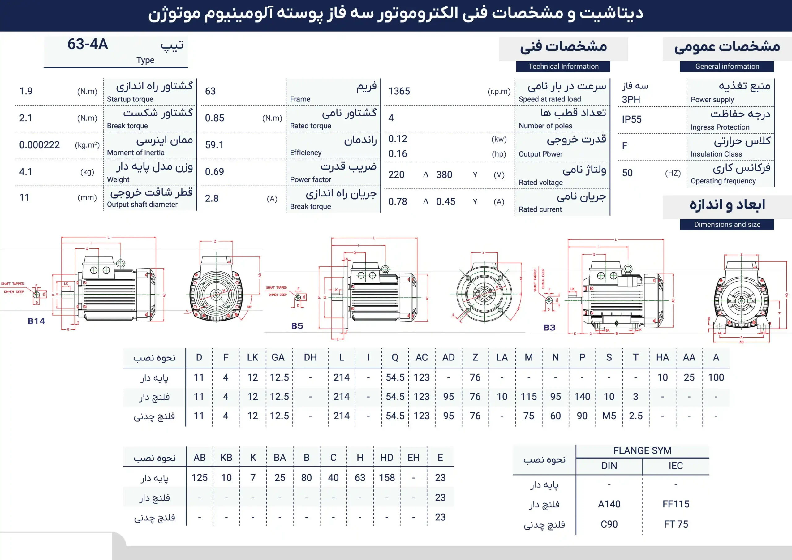 الکتروموتور موتوژن سهفاز ۰.۱۸ اسب (۰.۱۲ کیلووات) – پوسته آلومینیوم ۱۵۰۰ دور