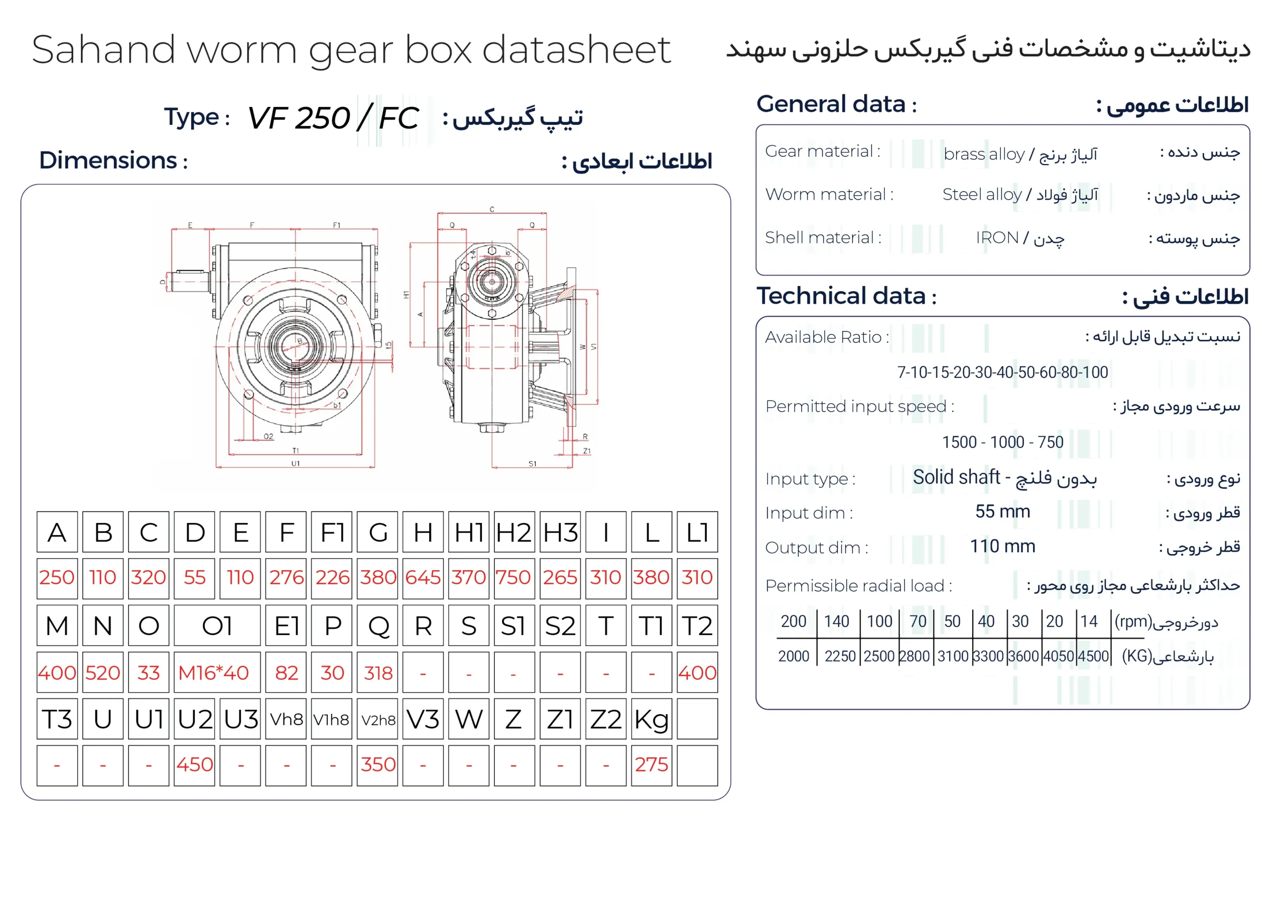 سایز ۲۵۰ یکی از بزرگترین و قدرتمندترین سایزها در سری VF FC سهند محسوب میشود و برای انتقال گشتاورهای بسیار بالا طراحی شده است. این گیربکس در صنایعی مانند فولاد، سیمان، معادن، صنایع معدنی، خطوط انتقال مواد حجیم و تجهیزات سنگین کاربرد گستردهای دارد. بدنه مقاوم و ظرفیت بالای تحمل بار، باعث شده این مدل در میان محصولات گیربکس حلزونی جایگاه ویژهای داشته باشد و در پروژههای صنعتی بزرگ بهطور مداوم مورد استفاده قرار گیرد.