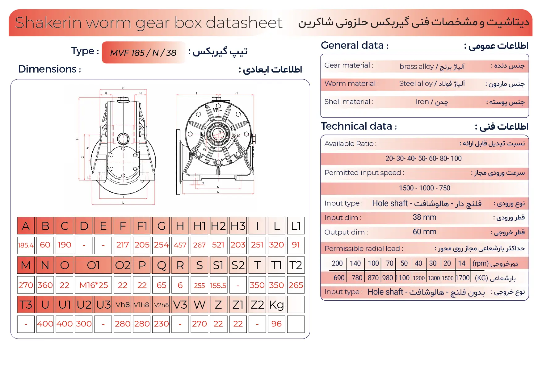 گیربکس شاکرین حلزونی MVF نرمال سایز ۱۸۵ بهصورت فلنجدار تولید میشود که نصب مستقیم و هممحور با موتور را ممکن میسازد. این نوع اتصال باعث کاهش تنشهای اضافی روی شافتها، افزایش دقت همراستایی و افزایش طول عمر قطعات داخلی میشود. طراحی فلنجدار همچنین موجب سهولت در مونتاژ و سرویسکاری گیربکس در خطوط تولید صنعتی خواهد شد.