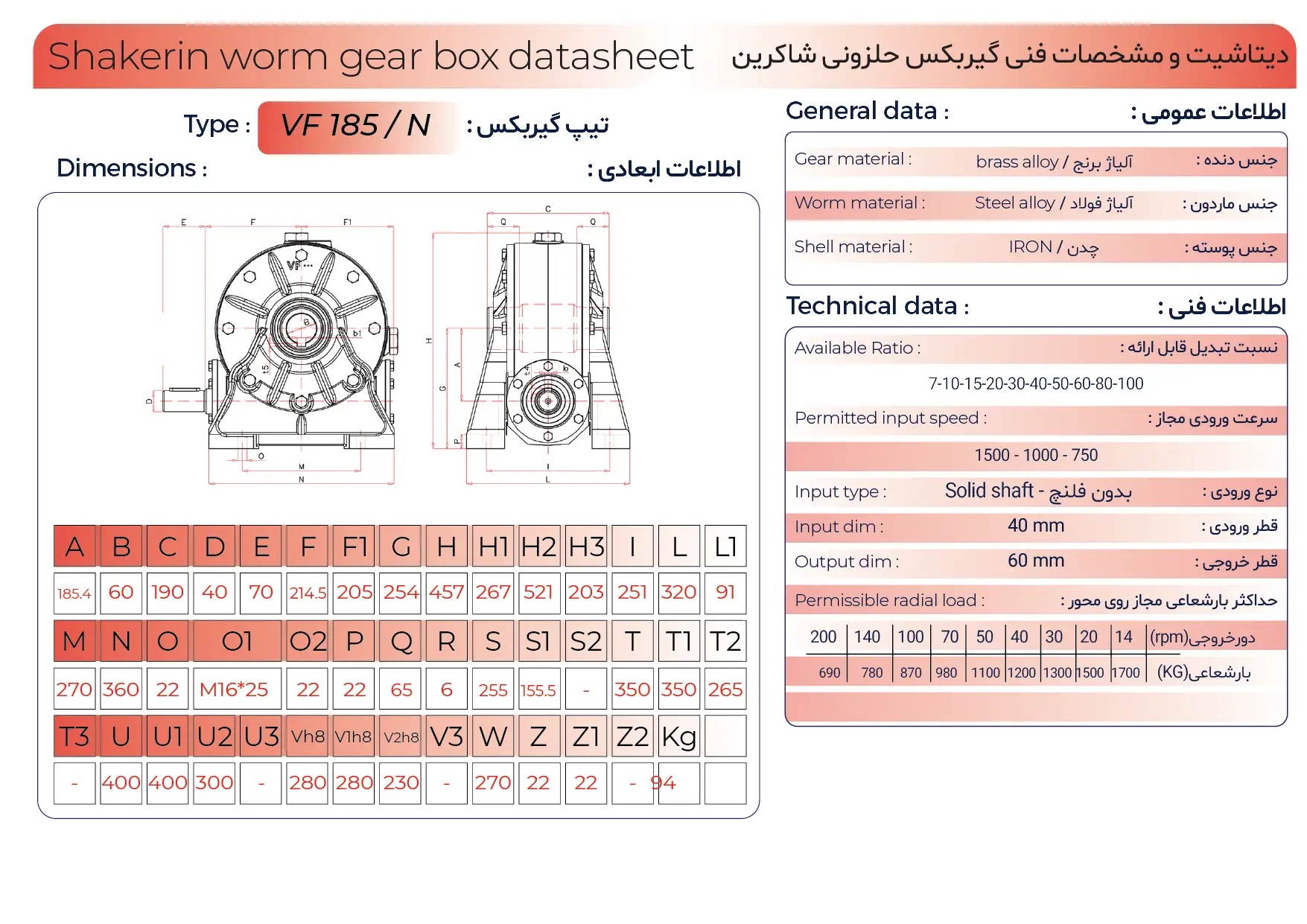 در این مدل، انتقال نیرو از طریق درگیری ماردون فولادی با چرخدنده برنزی انجام میشود که موجب کاهش ضربه، لرزش کم و صدای بسیار پایین در حین کار میگردد. همین ویژگیها باعث شده این محصول در خانواده گیربکس حلزونی جایگاه ویژهای داشته باشد. سایز ۱۸۵ به دلیل ابعاد بزرگتر و سطح تماس بیشتر دندهها، توان تحمل بار و گشتاور بالاتری را فراهم میکند و برای کاربردهای صنعتی سنگین انتخابی ایدهآل به شمار میرود.