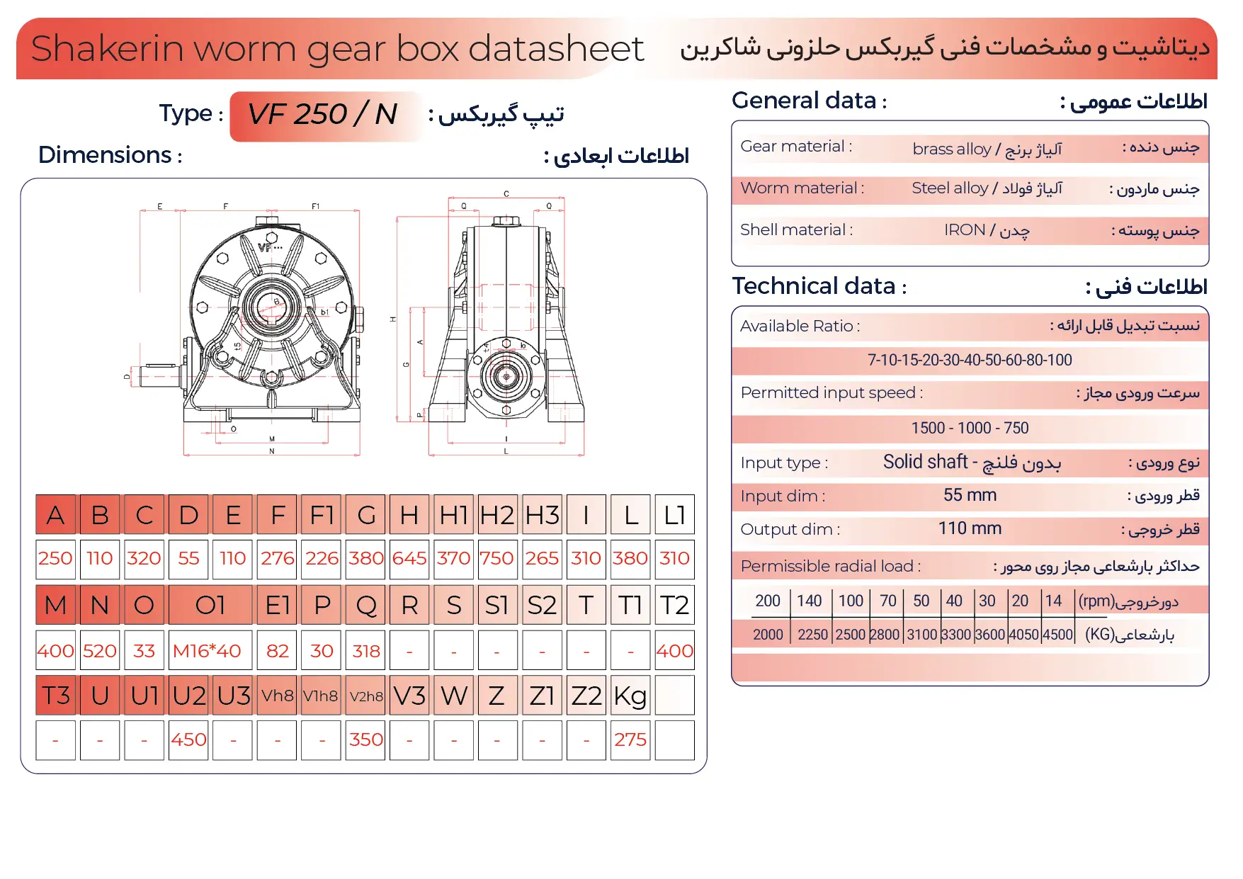 در گیربکس شاکرین حلزونی VF نرمال سایز ۲۵۰، انتقال نیرو از طریق ماردون فولادی سختکاریشده و چرخدنده برنزی با آلیاژ مقاوم انجام میشود. این نوع درگیری باعث توزیع یکنواخت نیرو، کاهش ضربههای مکانیکی و ایجاد حرکت نرم و بیصدا در خروجی میشود. همین ویژگیها سبب شده این مدل در دسته گیربکس حلزونی برای کاربردهایی که نیاز به گشتاور بسیار بالا در سرعتهای پایین دارند، جایگاه ویژهای داشته باشد. سایز ۲۵۰ بهعنوان بزرگترین سایز نرمال، توان تحمل بارهای شوکی و مداوم را بدون افت راندمان فراهم میکند.