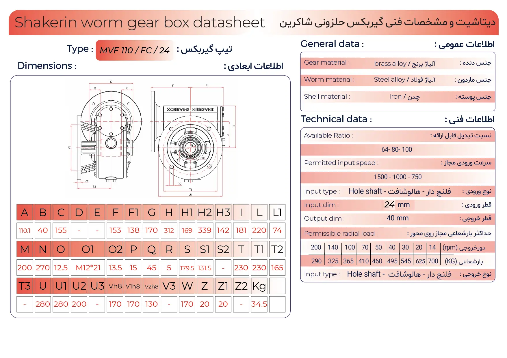 در گیربکس MVF FC سایز ۱۱۰ از پوستهای مستحکم استفاده شده که در برابر تنشهای مکانیکی و بارهای مداوم مقاومت بالایی دارد. این ویژگی در ساختار گیربکس حلزونی اهمیت زیادی دارد، زیرا تماس دائمی ماردون و چرخدنده میتواند موجب افزایش دما شود. طراحی بدنه بهگونهای انجام شده که دفع حرارت بهصورت یکنواخت صورت گیرد و قطعات داخلی در شرایط کاری پایدار و ایمن فعالیت کنند.