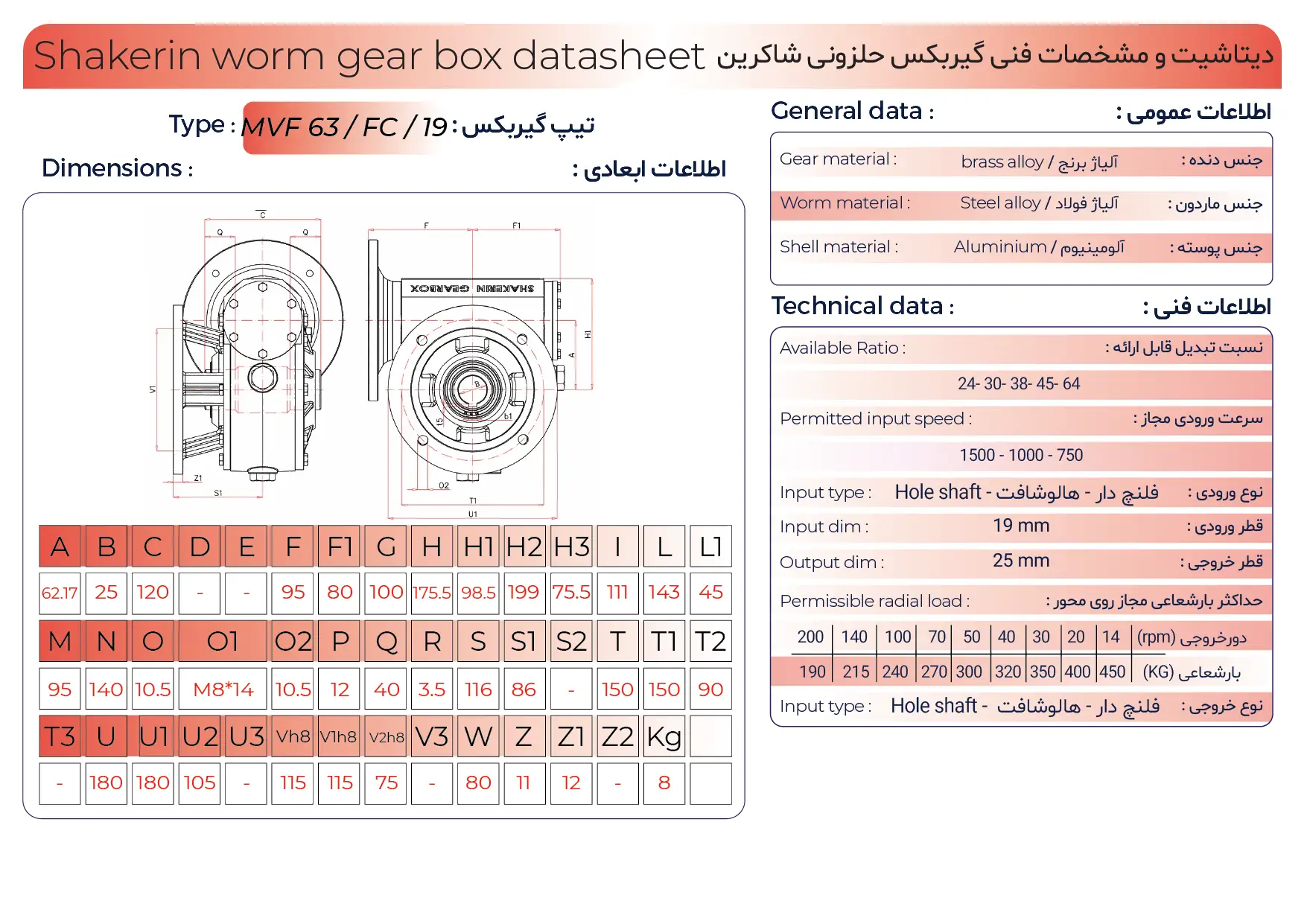 در گیربکس MVF FC سایز ۶۲ از پوستهای مقاوم و مهندسیشده استفاده شده که علاوه بر استحکام مکانیکی، به کاهش لرزش و نویز کمک میکند. این موضوع بهویژه در ساختار گیربکس حلزونی اهمیت دارد؛ جایی که تماس مداوم ماردون و چرخدنده میتواند منجر به افزایش دما شود. طراحی بدنه بهگونهای است که گرمای تولیدشده بهخوبی دفع شده و شرایط کاری پایدار برای قطعات داخلی فراهم میگردد.